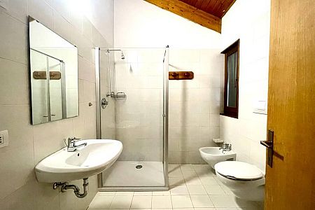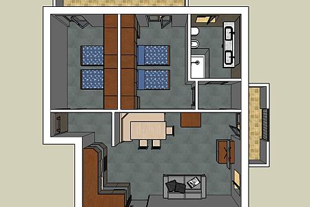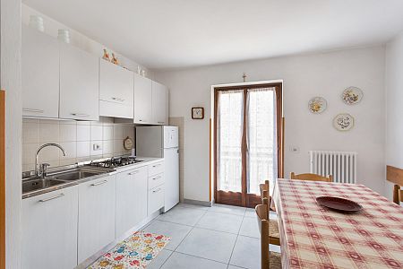 Composizione: cucina - soggiorno con divano, 2 camere (due letti singoli che si possono unire in ciascuna), bagno con doccia, balcone.