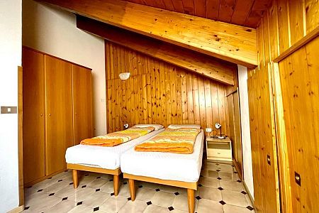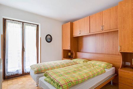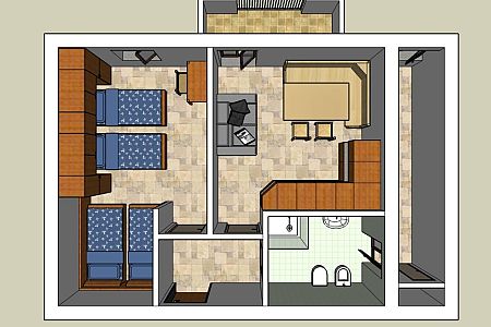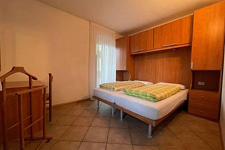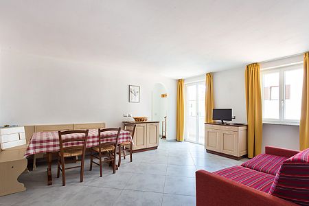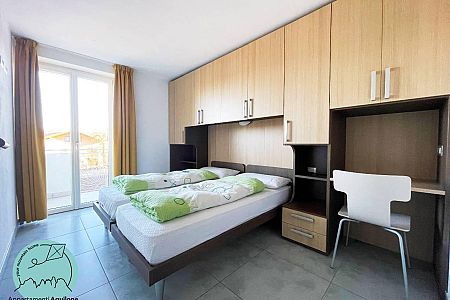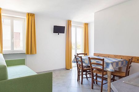 Composizione: cucina - soggiorno con divano, 2 camere (due letti singoli che si possono unire in ciascuna), bagno con doccia, balcone.