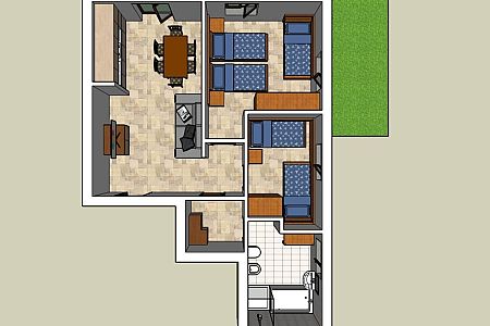 Composizione: cucina - soggiorno con divano, 2 camere (due letti singoli che si possono unire + terzo letto, due letti singoli non unibili), bagno con doccia e vasca, giardino.
