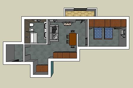 Composizione: cucina - soggiorno con divano, 2 camere (due letti singoli che si possono unire in ciascuna), bagno con doccia, 2 balconi.